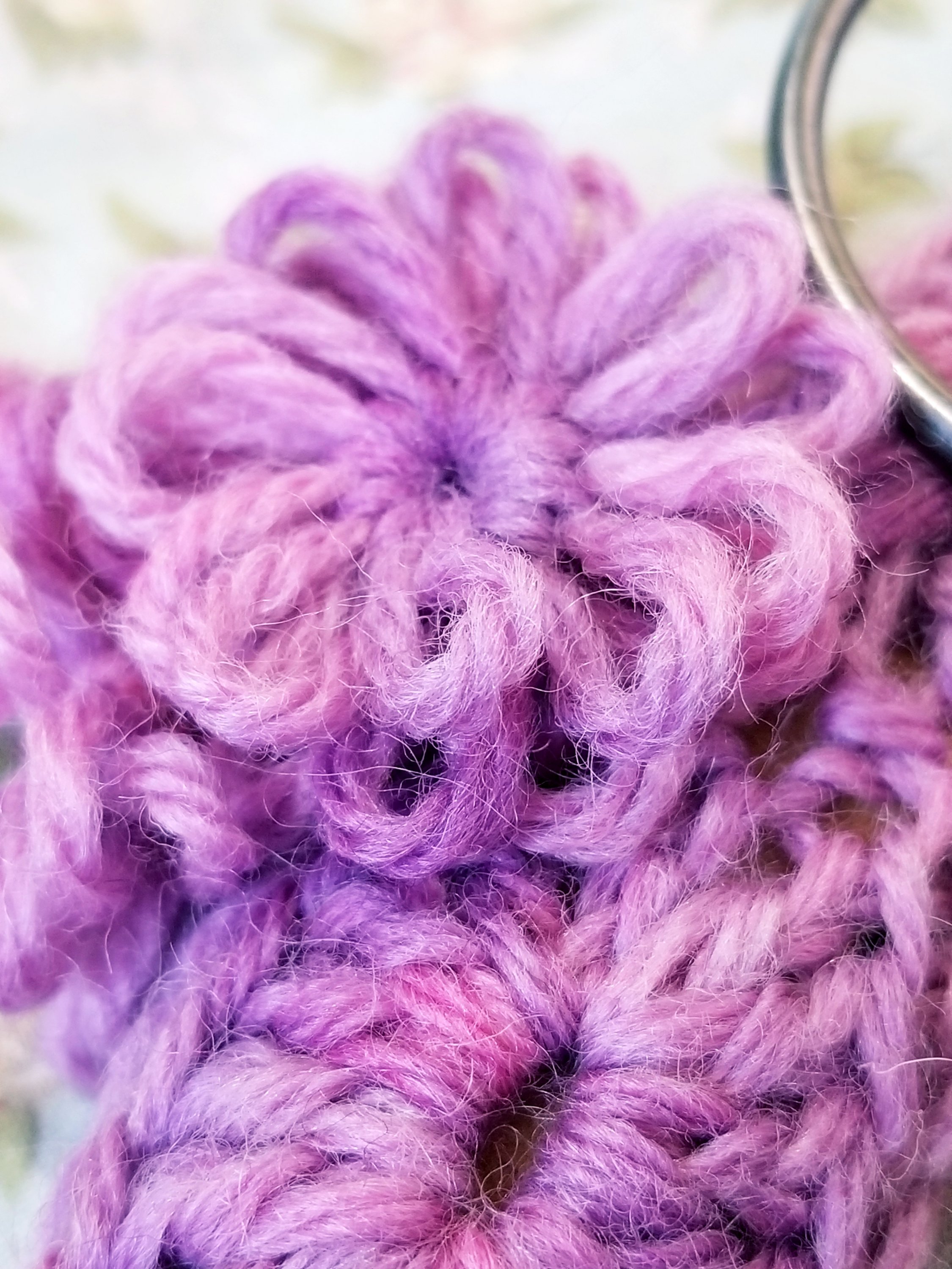 Pompoms are more traditional, but they also look beautiful with crocheted flowers. Leave tail ends to tie around the hanger hook, then weave them in.
