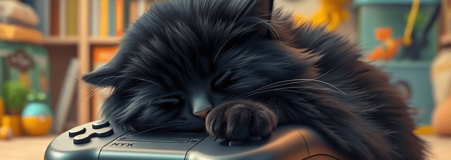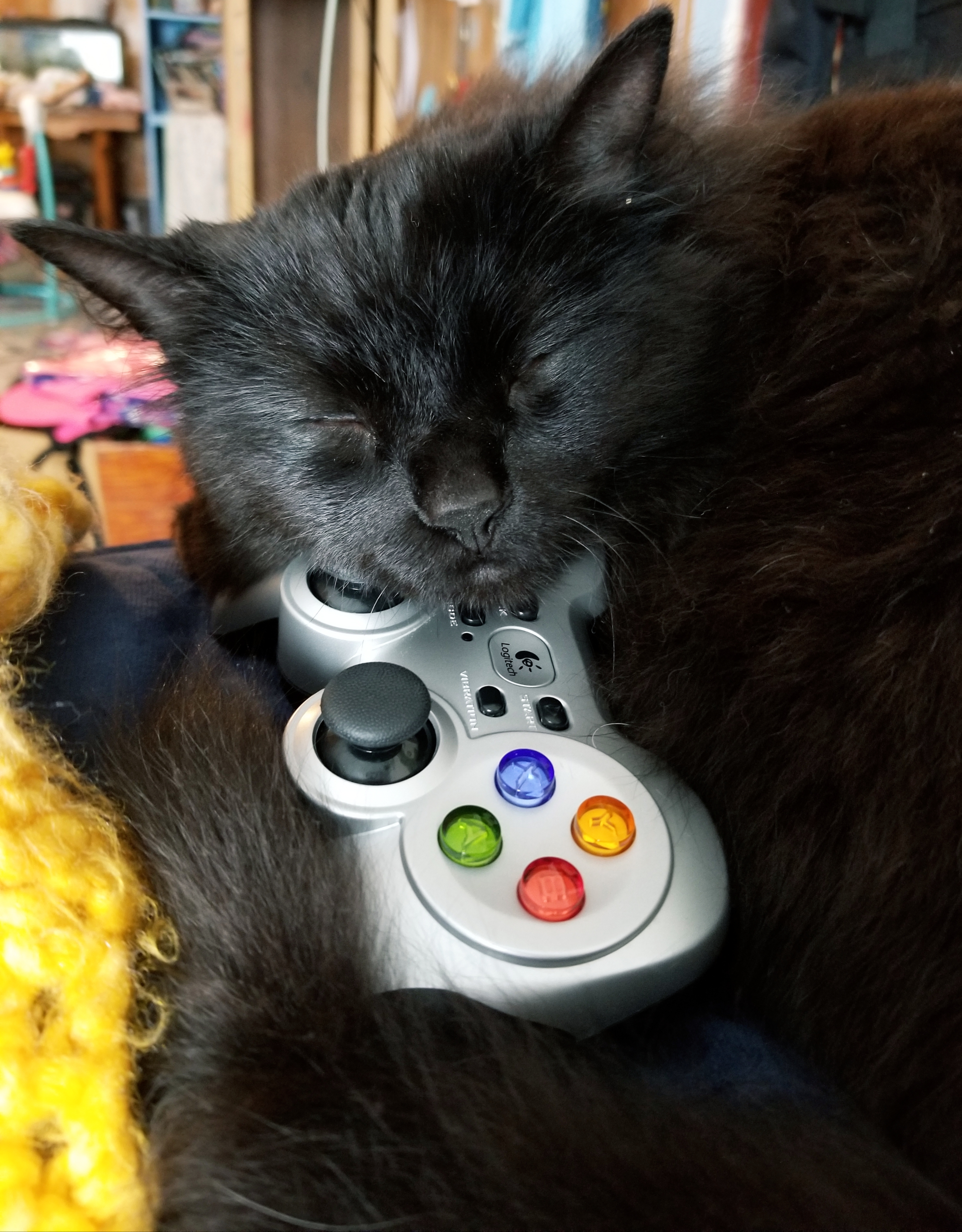 The visual part of your brain interprets that the picture is a photograph of a black fluffy cat sleeping on a game controller. There’s something knitted with bright yellow yarn on the bottom left, and the background has child-clutter, bookshelves, and even a fish tank. How ’bout that.