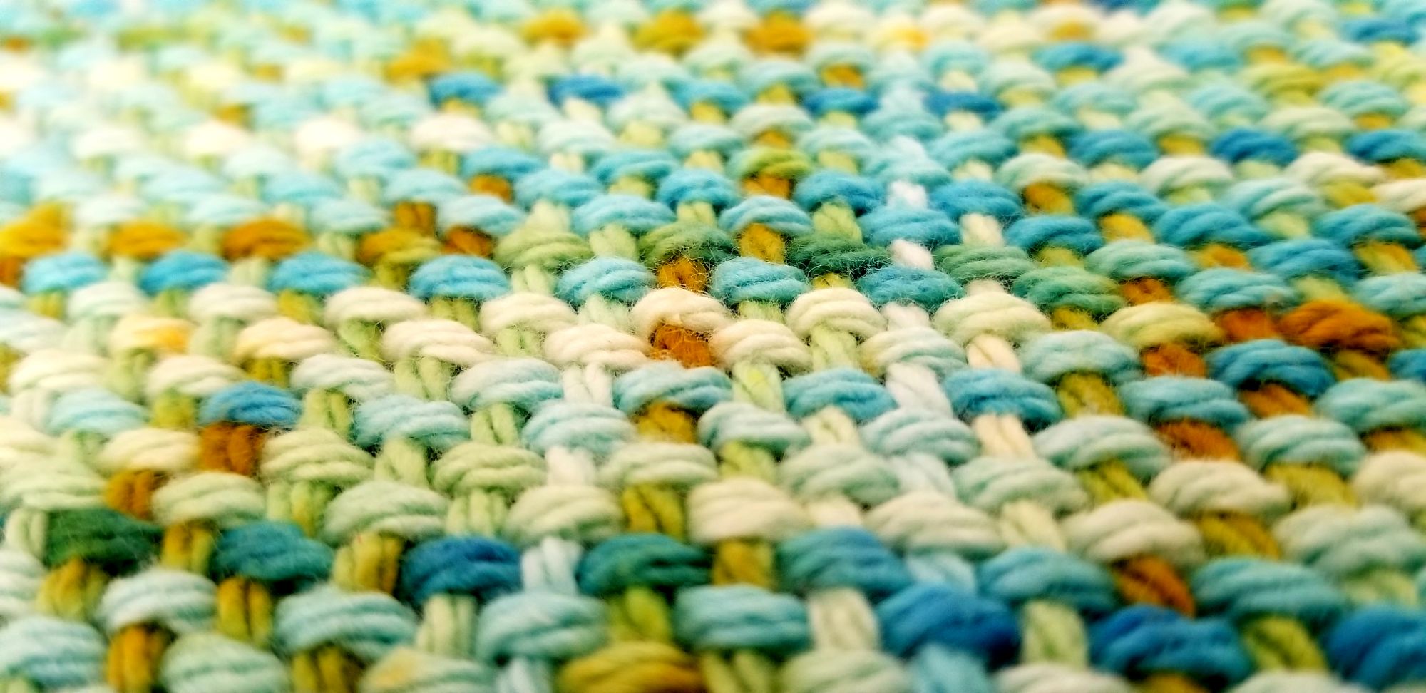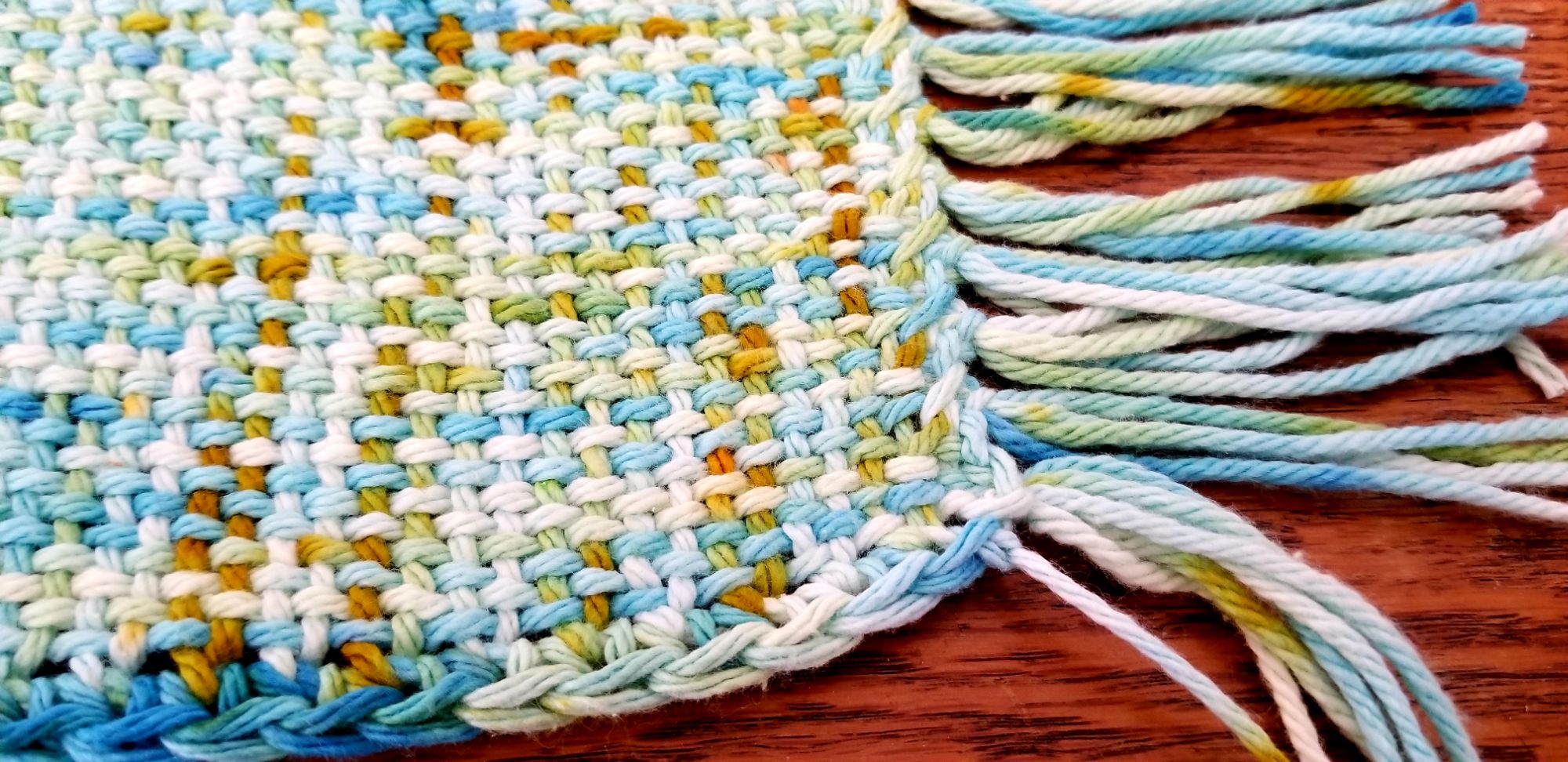 The yarn is Lily Sugar n Cream cotton, and I hand-dyed it myself. It’s small enough to fit neatly on the top of my dresser, with plenty of room for … all those other things that seem to end up on top of dressers, lol. The hand-dyed colors combined with plain weave make me think of crosshatching with colored pencils, and it’s especially pleasant to look at from a distance.