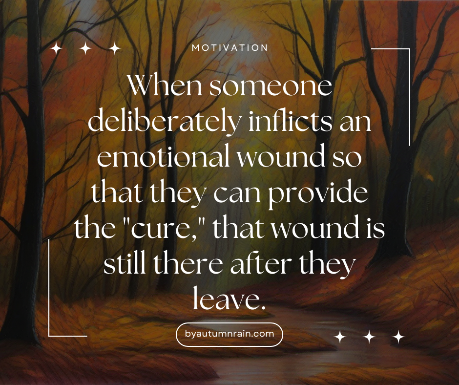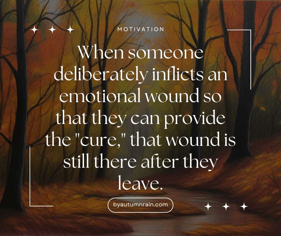 It might be difficult to understand if you haven’t been through this, but when someone deliberately inflicts an emotional wound so that they can provide the “cure,” that wound is still there after they leave. Real healing takes time and is very difficult, especially when you feel the withdrawal from the false cures they fed you. It hurts severely to acknowledge that they weren’t trying to help you improve, but instead deliberately keeping you dependent.