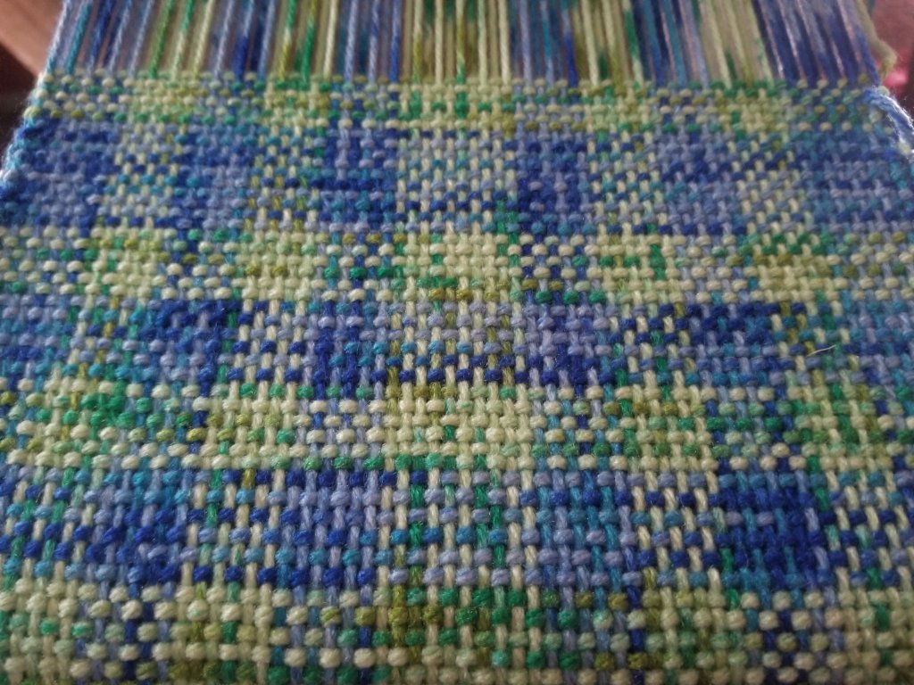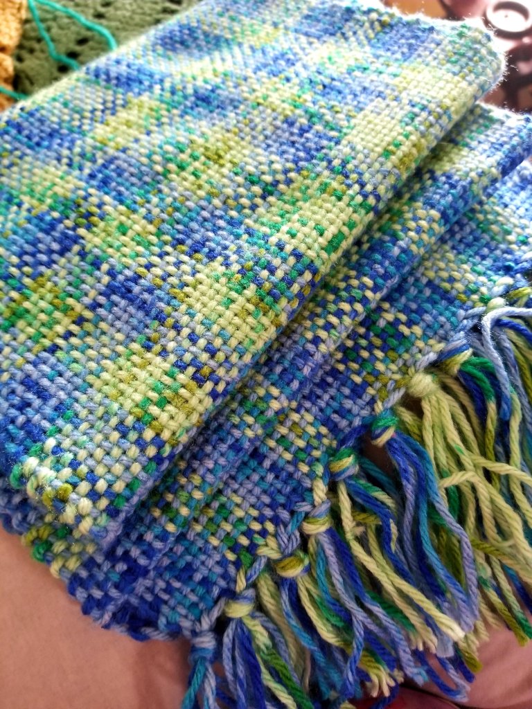 I’ve been going through my stash of acrylic yarn on practicing, experimenting, and learning, and finally decided that I was up for using my handspun on the loom. The result is pictured above.