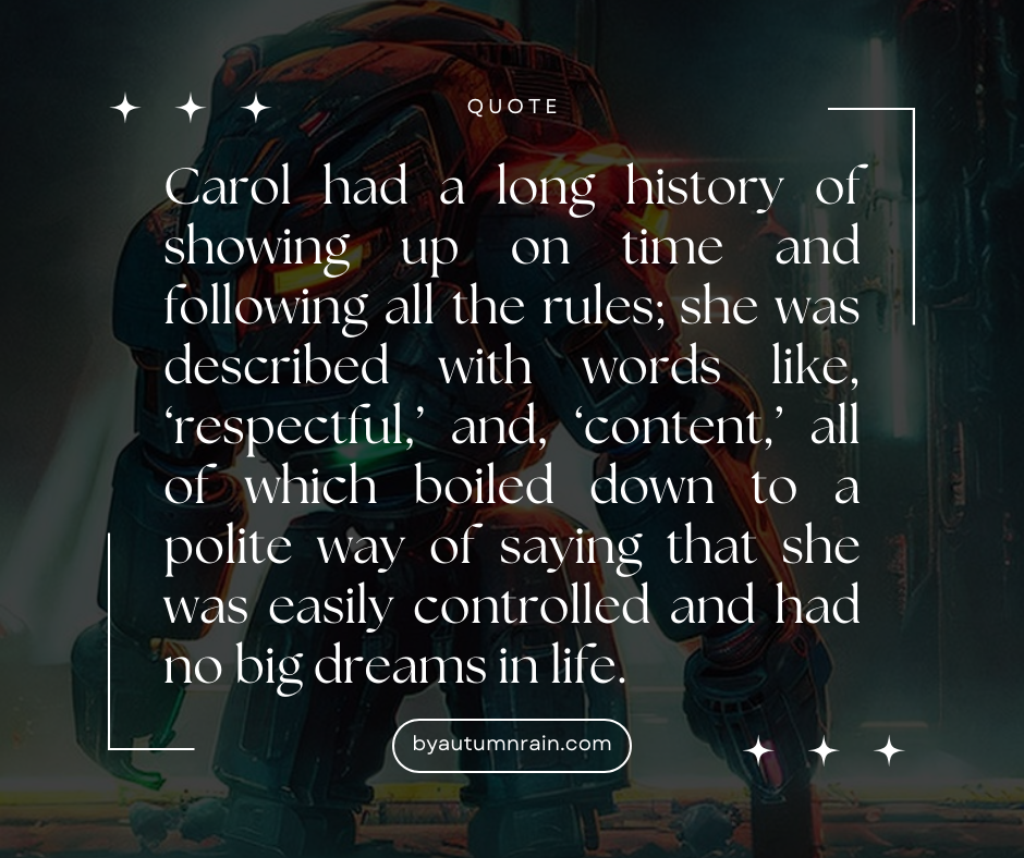 Out of curiosity, he opened the personnel file he still carried. Carol had a long history of showing up on time and following all the rules; she was described with words like, โrespectful,โ and, โcontent,โ all of which boiled down to a polite way of saying that she was easily controlled and had no big dreams in life. Hartmann looked back up at her, noting the way she hunched over and kept her elbows close, and he thought that she likely considered any clothing brighter than beige to be too flashy. Carol was someone who had perfected invisibility, so why had the captain noticed her as well?