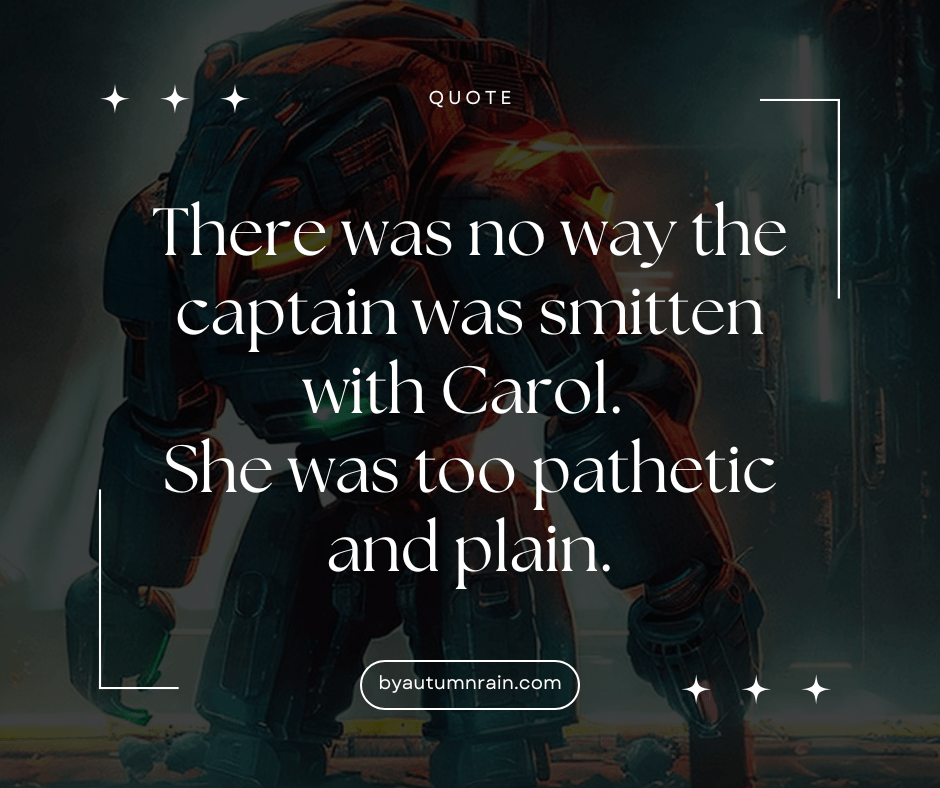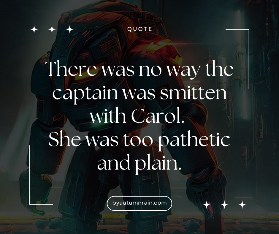 There was no way the captain was smitten with Carol. She was too pathetic and plain. All she had going for her was the fact that she cleaned the Suit โฆ and the way her hair brushed the top of her petite shoulders, promising a feminine clavicle hidden underneath the neckline of her t-shirt. Hartmann thought about how she had felt under his hands, and how her soft muscles had struggled to pull away from him without any success.
