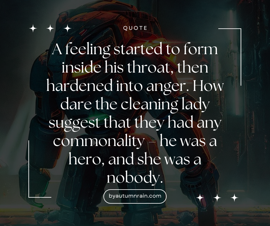 Hartmann was momentarily lost for words as some sort of electrical shock pulsed through his chest. A feeling started to form inside his throat, then hardened into anger. How dare the cleaning lady suggest that they had any commonality โ he was a hero, and she was a nobody. She was only there through some unexplained fluke, because some computer inside the Suit had called her โcommander.โ If not for that, her place would be in the shadow of his glory, unnoticed as she maintained the Suit for him.