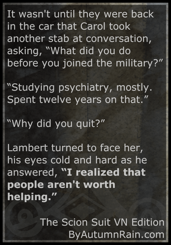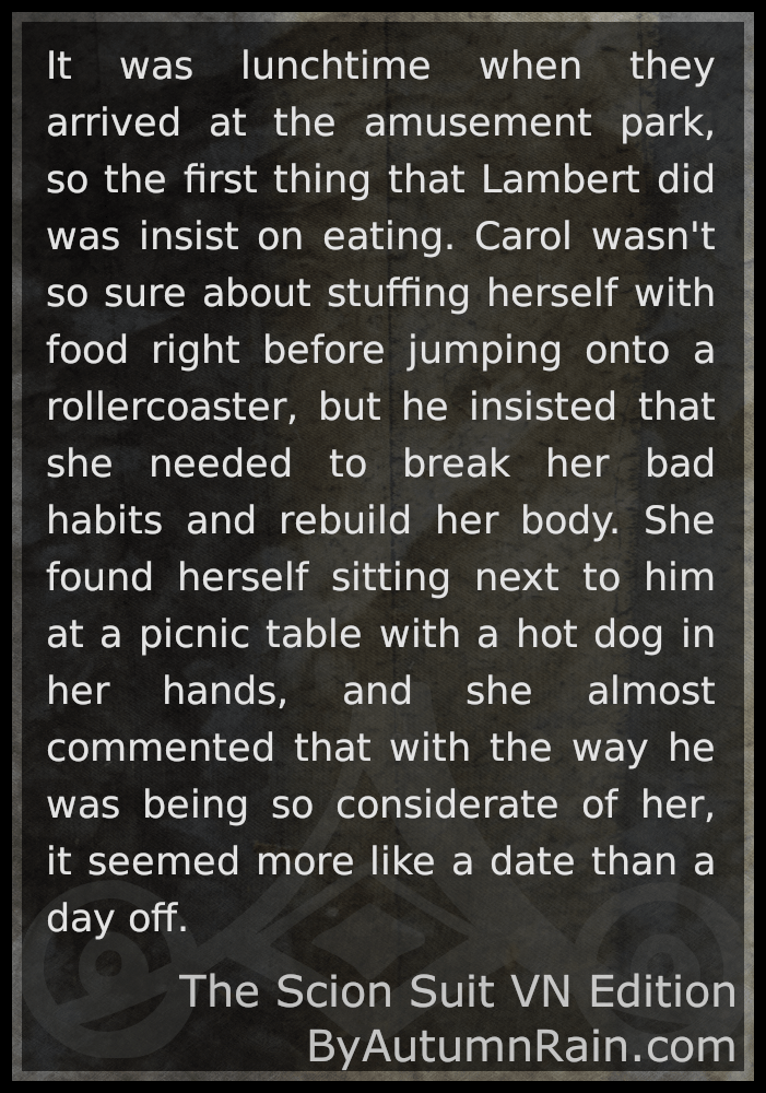 Carol had never felt anything towards anyone before, and had never had a reason to be uncomfortable with that fact, either. But something about Lambert was strangely familiar, as if they were simply falling back into a relationship that had begun long ago. Somehow, she was certain that she had been to his house before, and had sat in the living room watching a movie in much the same way, only this time they were finally indulging in their feelings for each other.