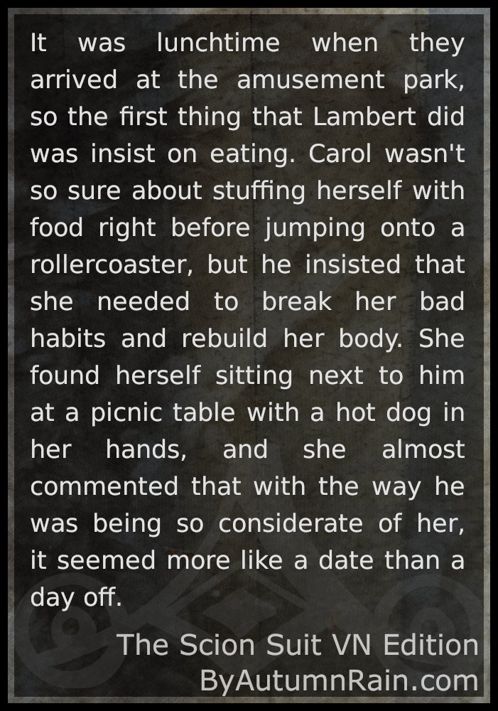 Carol had never felt anything towards anyone before, and had never had a reason to be uncomfortable with that fact, either. But something about Lambert was strangely familiar, as if they were simply falling back into a relationship that had begun long ago. Somehow, she was certain that she had been to his house before, and had sat in the living room watching a movie in much the same way, only this time they were finally indulging in their feelings for each other.